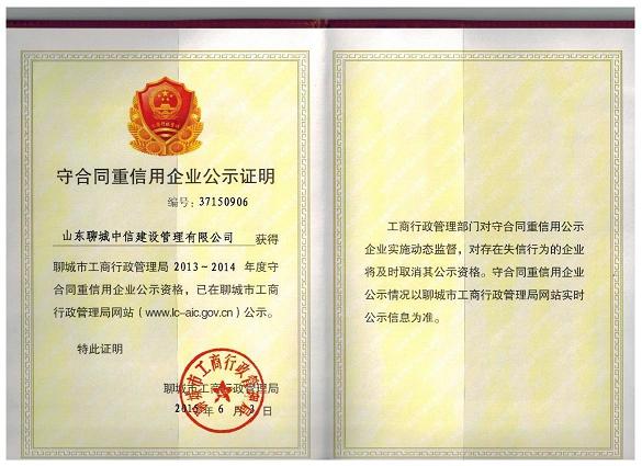 熱烈祝賀公司榮獲:“2013—2014年度市級(jí)守合同重信用”榮譽(yù)稱號(hào)