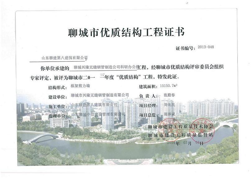 興隆無縫鋼管工程被評為聊城市2013年度優(yōu)質(zhì)結(jié)構(gòu)工程